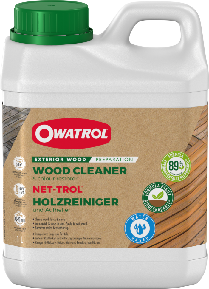 NET-TROL® е биоразградим водоразтворим гел, предназначен за възстановяване на потъмняло и замърсено дърво без обезцветяване. Действа бързо – само за 15 минути – и е идеален за реновиране на външни дървени повърхности.