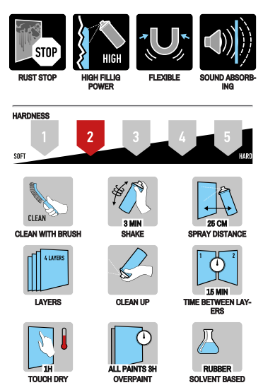 MASTON Спрей покритие за предпазване от камъни осигурява ефективна защита за автомобилни части, податливи на удари от камъчета. Благодарение на своята гумена консистенция, той предпазва от наранявания и ръжда и има шумоизолиращ ефект.
