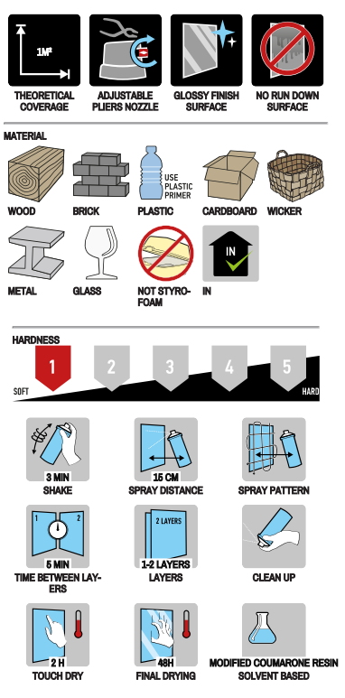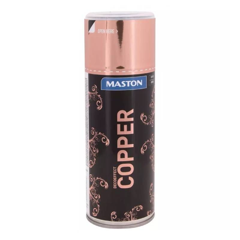 MASTON DECOEFFECT SPRAYPAINT е много гланцова декоративна боя за вътрешна употреба. Тя образува лъскава, високо гланцова повърхност, доста подобна на оригиналните полирани метали. Може да се използва върху дърво, метал, стъкло, изкуствени повърхности, както и за боядисване на изсушени растения. Не е подходяща за клетъчна пластмаса. Покритие 1-2 м2. Ограничена устойчивост на атмосферни влияния. Не издържа на силно триене или висока температура. Може да се покрие отново със спрей лак Maston Deco Effect за по-добра устойчивост на износване и атмосферни влияния след 12-24 часа.