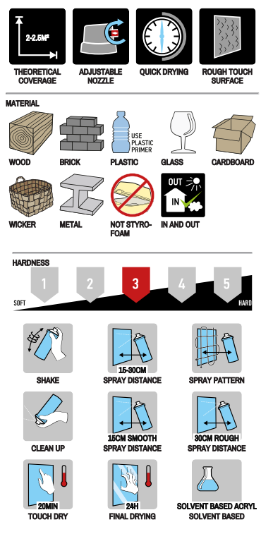 Когато използвате продукта на закрито, уверете се, че зоната в радиус от поне 5 метра от боядисания предмет е защитена. Прахът от боя е лек и може да се разпространява на големи разстояния чрез вентилация.