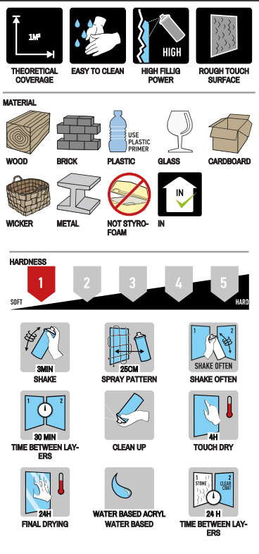 СПРЕЙ MASTON STONE EFFECT придава вида и усещането на естествен камък на всяка повърхност. Тази уникална формула придава текстурирано, многоцветно покритие. Тя ще трансформира обикновените предмети в красив каменен ефект. Използвайте акрилен грунд. Само за вътрешна употреба. Повърхността има ограничена устойчивост на износване. За по-добра защита, покрийте с акрилен лак Maston. Не се препоръчва повторно нанасяне на други бои. Забележка: Разклащайте флакона често, винаги след като спрете да пръскате. Бутилката не включва смесителни топки. Когато използвате продукта на закрито, уверете се, че зоната в радиус от поне 5 метра от боядисания обект е защитена. Прахът от боя е лек и може да се разпространи на големи разстояния чрез вентилация.