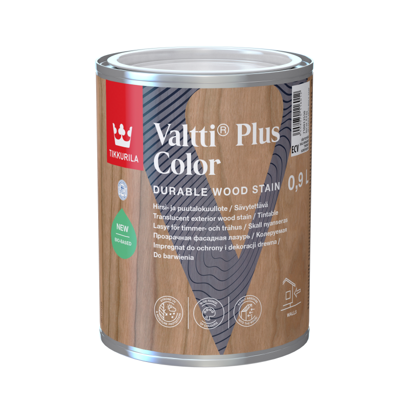 Устойчив масло за дървени повърхности. Лесно се абсорбира в дървото, подчертавайки дървената структура. Силната UV и влагозащита прави дървената повърхност устойчива на атмосферни влияния. Предлага се в широка гама от цветове чрез тониране. За Valtti Plus Color 73% от общия органичен въглерод е заменен с биобазирано съдържание (измерено в съответствие с ASTM D6866-18), което означава, че 17% от общото съдържание на продукта е на биобаза.